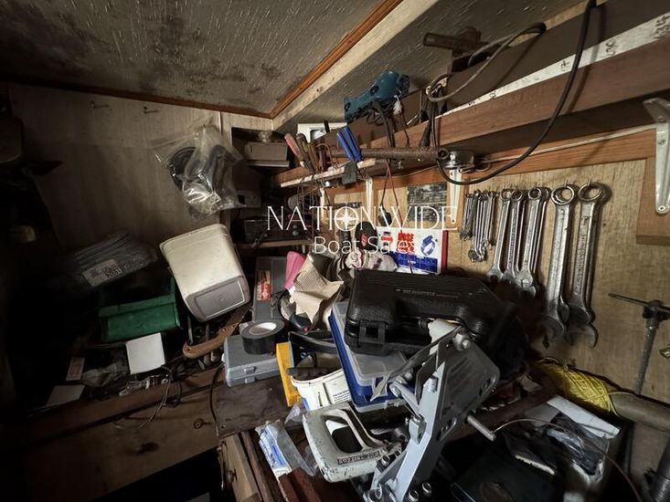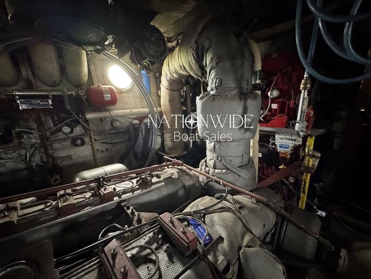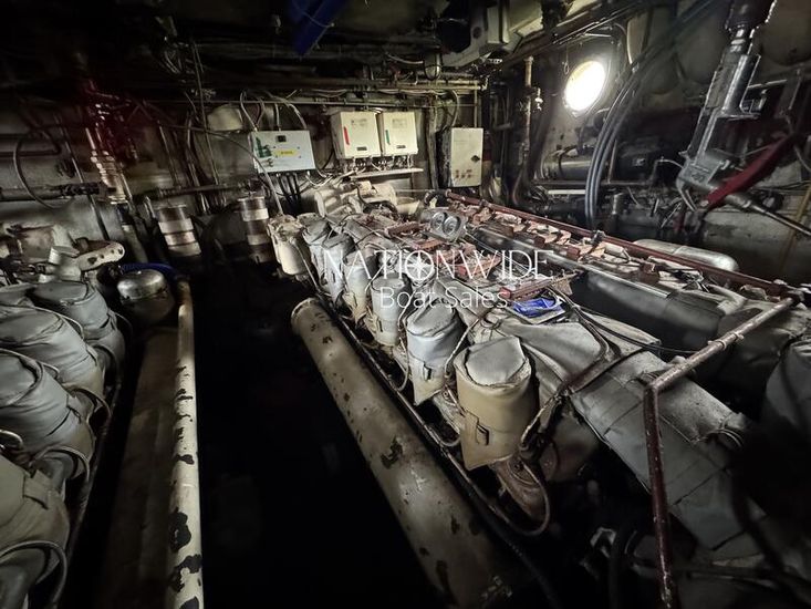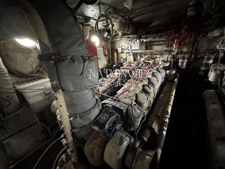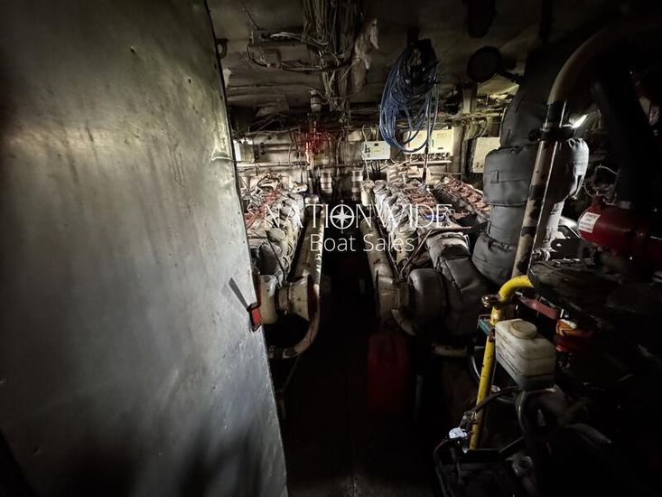 The engines are housed in an engine room, which also features a workshop area leading to the crew cabin.